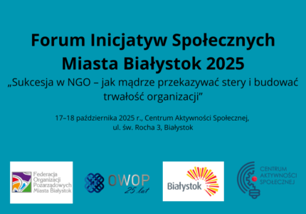 Forum Inicjatyw Społecznych Miasta Białystok 2025 „Sukcesja w NGO – jak mądrze przekazywać stery i budować trwałość organizacji” 17–18 października 2025 r., Centrum Aktywności Społecznej, ul. św. Rocha 3, Białystok Federacja Organizacji Pozarządowych Miasta Białystok wspólnie z Prezydentem Miasta Białystok oraz Ośrodkiem Wspierania Organizacji Pozarządowych a także Centrum Aktywności Społecznej […]
